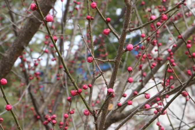 在另一个小区内,红梅树上蓓蕾一串串,一簇簇,一排排。有的抢先露出笑脸,迎春开放,装点着春色,装点着生活,丰富着时光,也希冀人们的理想!