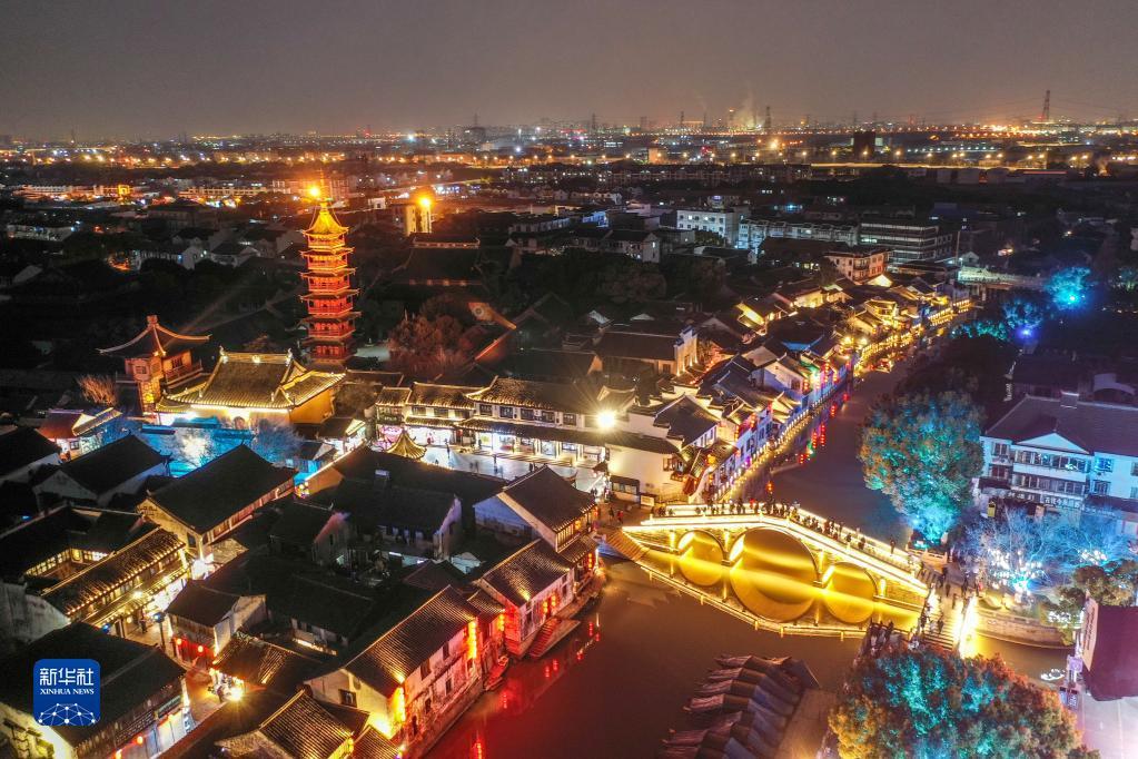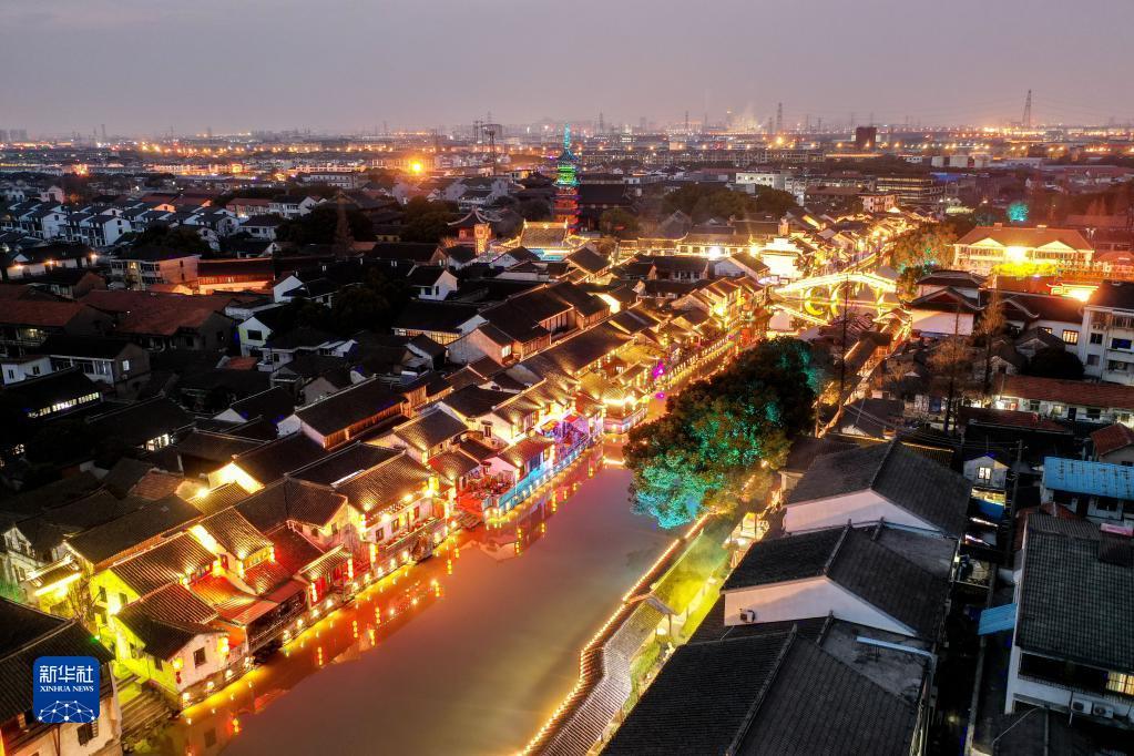 千灯古镇的灯光秀景色。(2月3日摄 无人机照片)