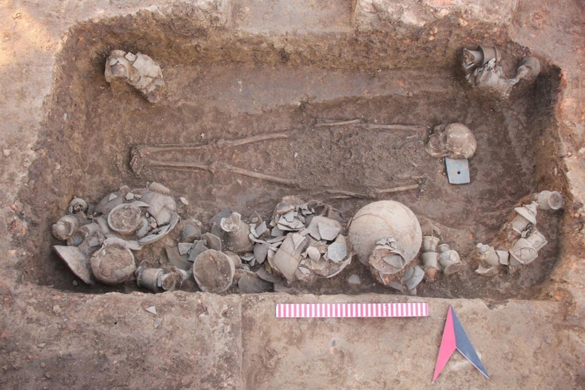 穆林头遗址发掘领队、湖北省文物考古研究院研究馆员笪浩波告诉极目新闻记者,此次发掘面积为500平方米,重要收获是清理出屈家岭文化时期墓葬9座、灰坑35个、房址7座(其中有一座∏字形排房)、窑2座,出土玉钺、玉璋、玉璜及玉镯等重要文物。