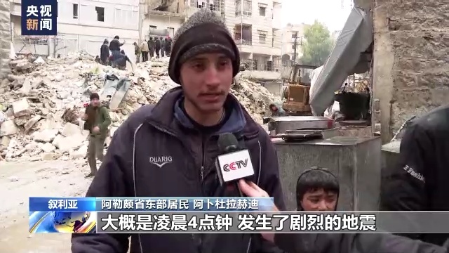 叙利亚阿勒颇省东部居民 阿卜杜拉赫迪:大概是凌晨4点钟,发生了剧烈的地震。我们家的门开始剧烈晃动把我们惊醒了,我们迅速跑出来,现在我们的楼很危险,不能再居住了。