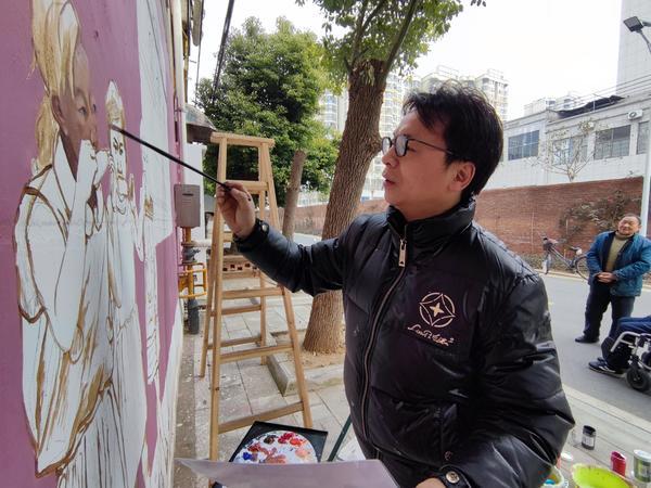 2023年2月7日,湖北省云梦县,美术师在云梦棉纺厂小区描绘饱含历史记忆的文化墙画。