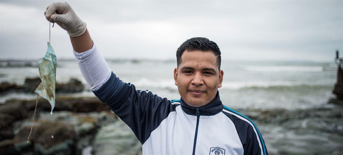 一名学生在厄瓜多尔参加海滩清洁活动(图片来源:联合国官网)