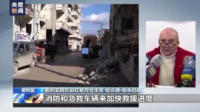 叙利亚阿拉伯红新月会主席 哈立德·哈布巴提:我们需要重型机械,消防和急救车辆来加快救援进度,我们需要消防车去灭火,需要设备去救人,但因为西方制裁,我们现在面临太多困难。遇难者人数今后将会继续上升,这将造成毁灭性的后果,现在出现裂缝的建筑未来都会倒塌。