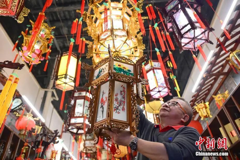 图为长堤历史文化街区内,江门东艺宫灯省级非遗传承人、美籍华人李仰东展示东艺宫灯。中新社记者 陈骥旻 摄