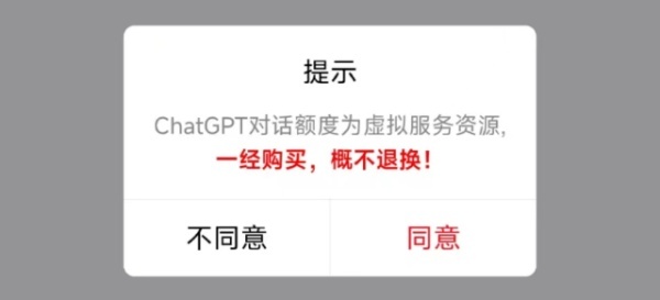 需要注意的是,在唤起支付界面,用户必须确认接受“ChatGPT对话额度为虚拟服务资源,一经购买,概不退换”的风险提示,才能继续购买相应服务。