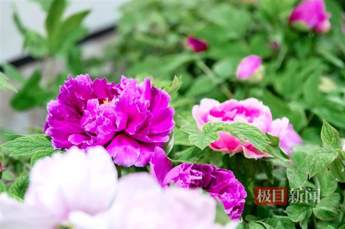 牡丹展厅,白、粉、红、紫、蓝、绿、黄等九色牡丹花团锦簇,1500株牡丹正值盛花期,40多个品种全部开放。最负盛名的黄牡丹“巴茨拉”拥有一半牡丹一半芍药的血统,是公认最美的伊藤杂种牡丹,具有极高的观赏价值和经济价值。它的叶子和茎似芍药,花型和香味似牡丹,花为橙黄色,蕊中心为翠绿色,还具备几分青柠檬香气。此外,近日还新增了正红色的“旭港”、白色的“白王狮子”等牡丹品种。