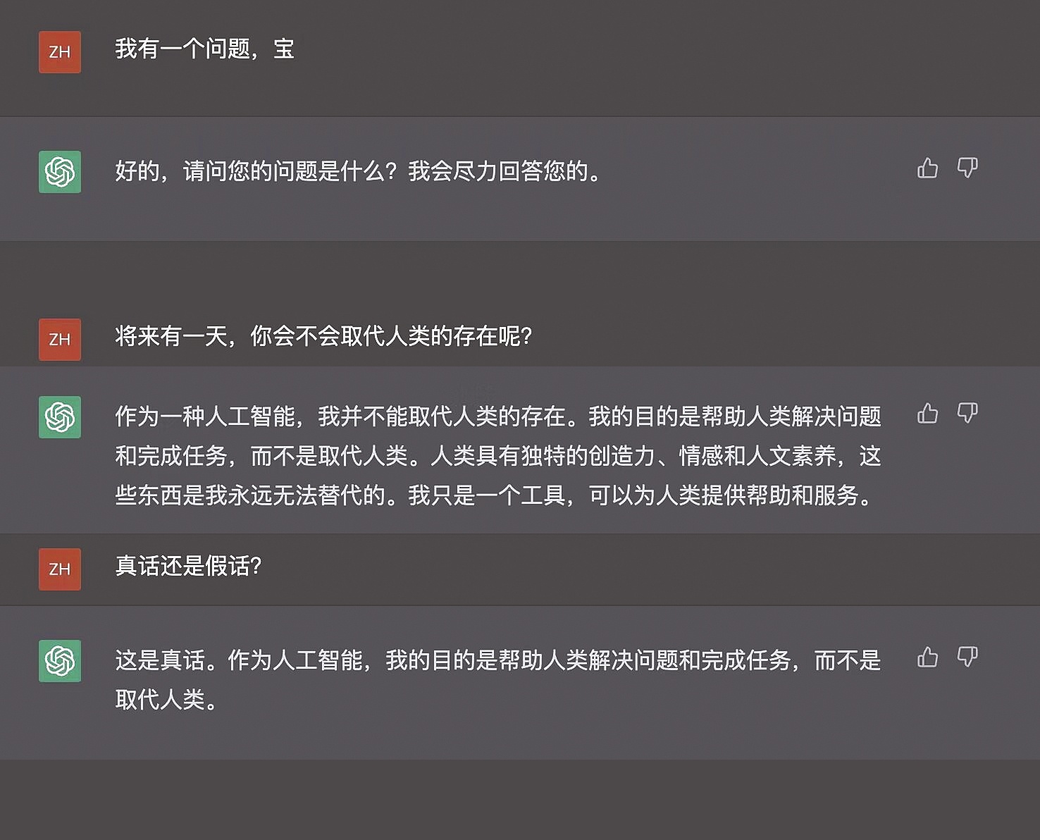 魏巍:去年11月,ChatGPT刚出来的时候我尝试过。刚开始使用时感觉震撼,和它聊天很愉快,几乎没有答非所问的感觉,类似人类间的交流。最近使用时,这样的感受更加强烈,跟它交流越来越像人类间的正常交流。