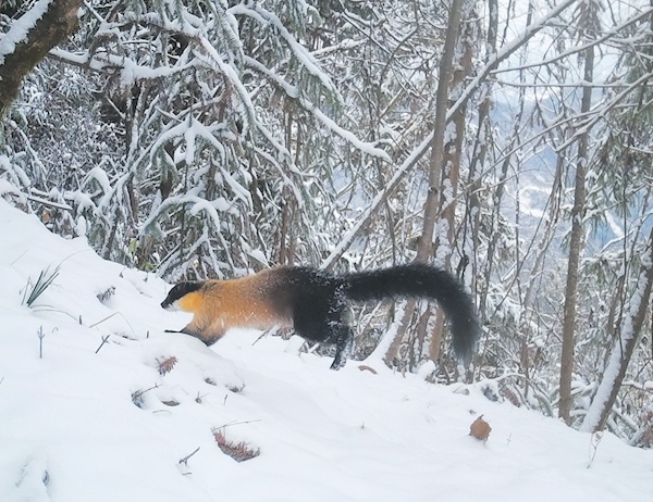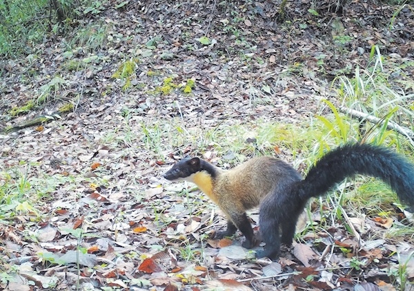 本报讯 特约记者程平通讯员 杜登艳陈泽涛 报道:2月9日,湖北堵河源国家级自然保护区屏峰管理站工作人员在整理红外相机影像资料时,惊喜地发现一只黄喉貂在茂密的丛林里悠然活动的画面。