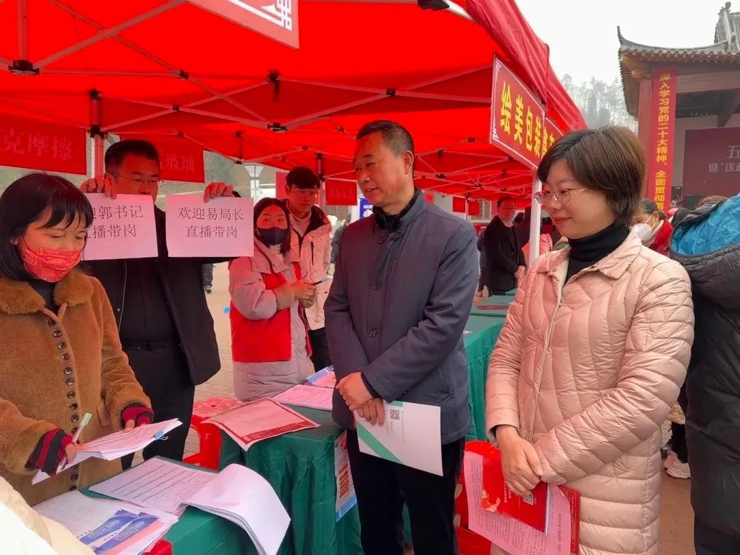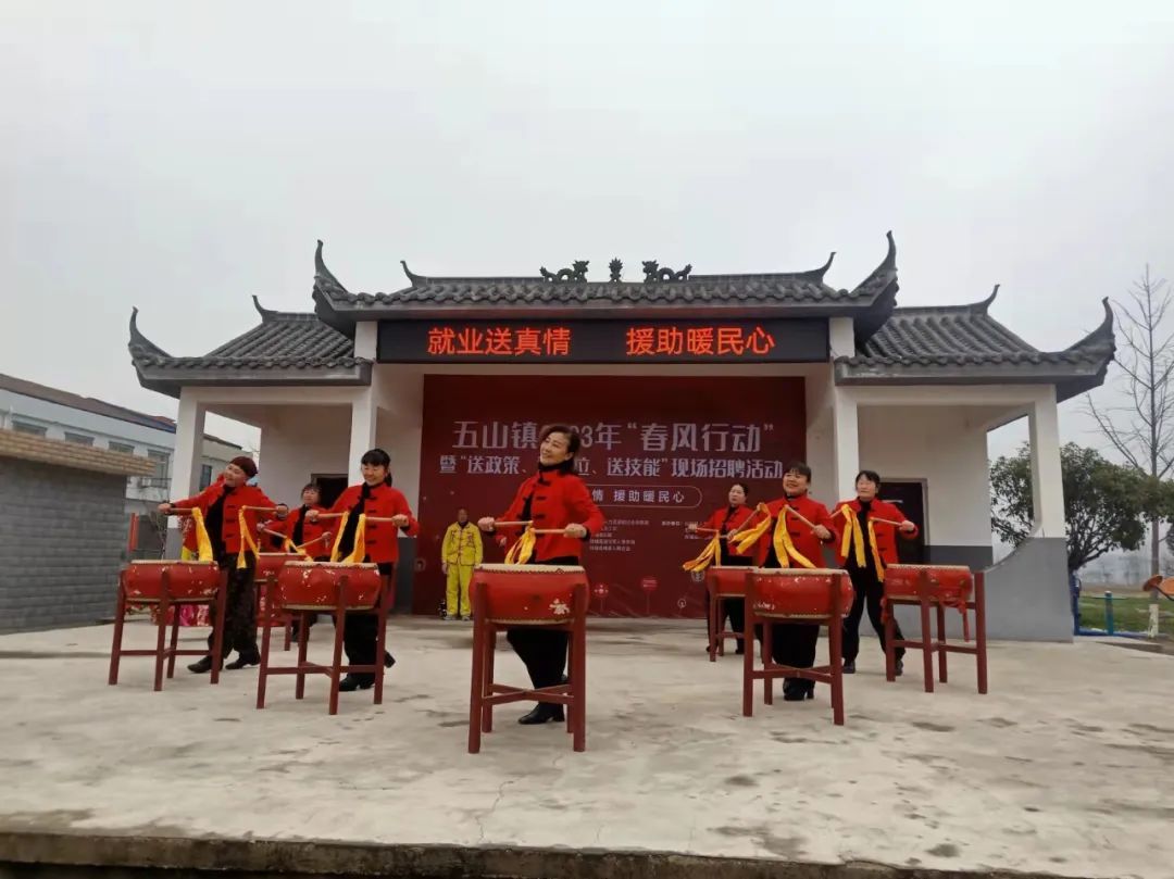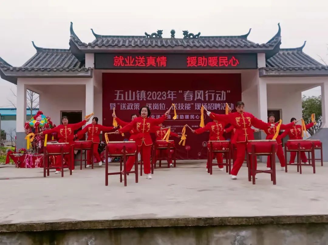 招聘会现场,谷城县人社局局长易友举,五山镇党委书记郭芬,五山镇党委副书记、镇长陈小锋现场带岗,每个招聘单位展区都排满了求职者,现场氛围热火朝天。五山民间艺术团十六名演员现场表演了舞龙、威风锣鼓、舞蹈等八个节目。