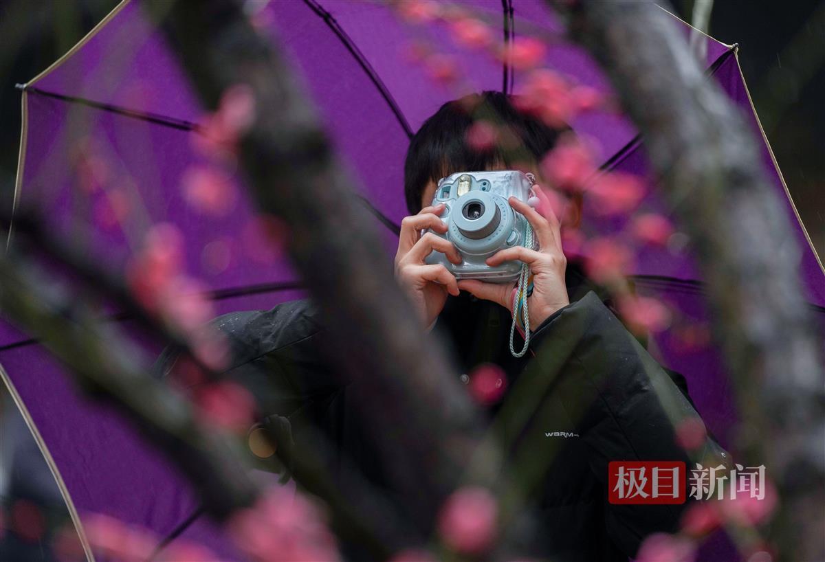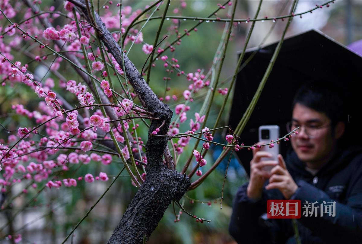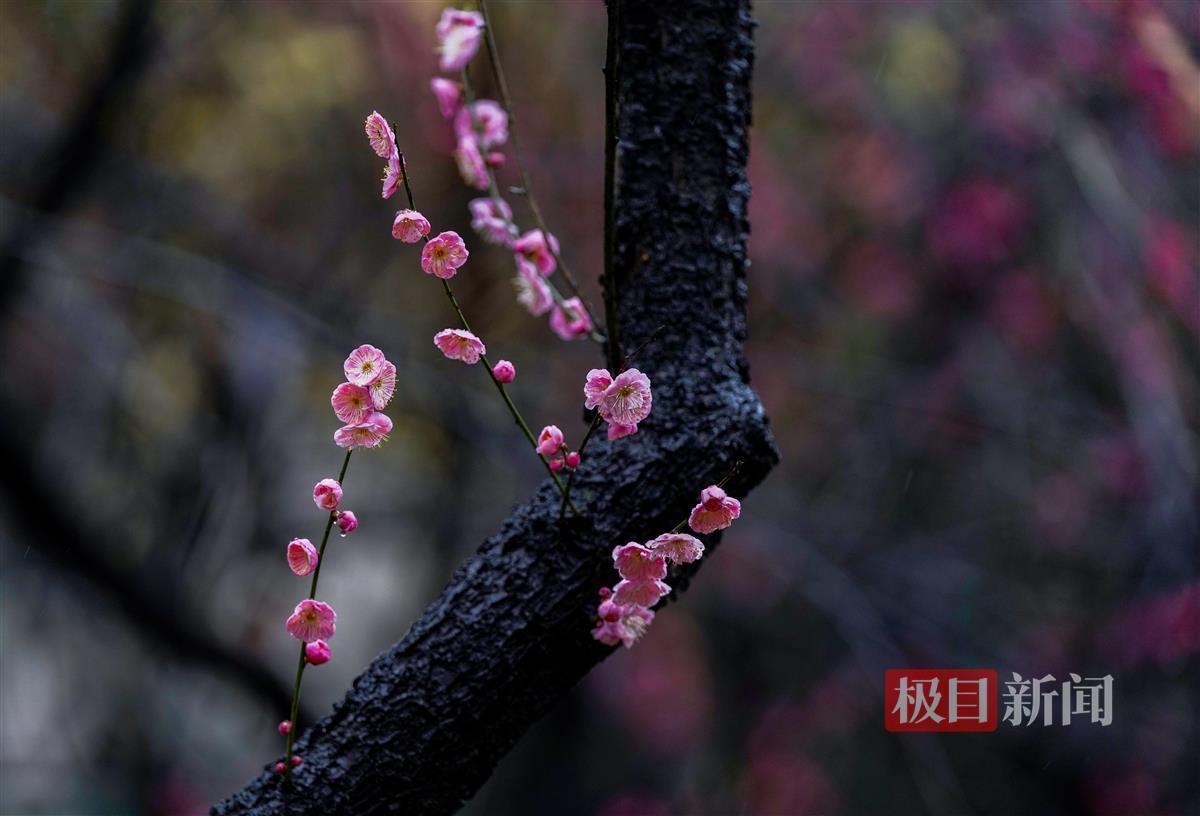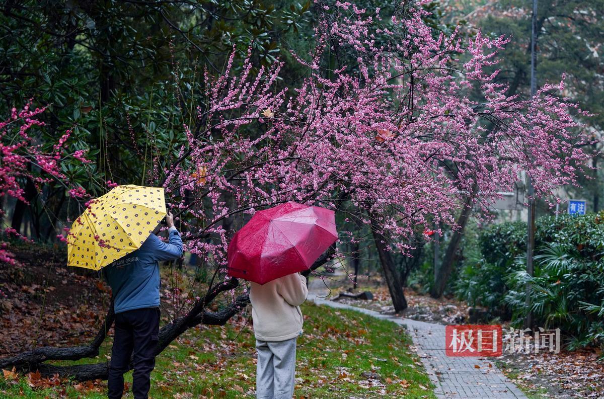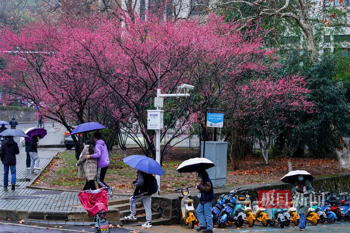 2月13日,极目新闻记者现场看到,位于该校樱花大道鉴湖入口、万林博物馆背后等处小梅林,株株梅树迎着淅沥沥的寒雨傲然绽放娇艳的花朵。不少提前返校的学生打着五颜六色的雨伞,前来赏梅、拍梅。
