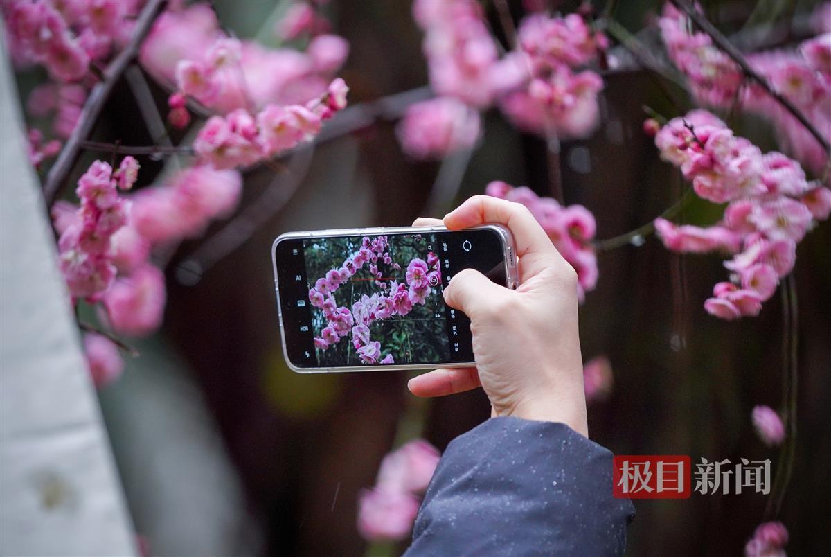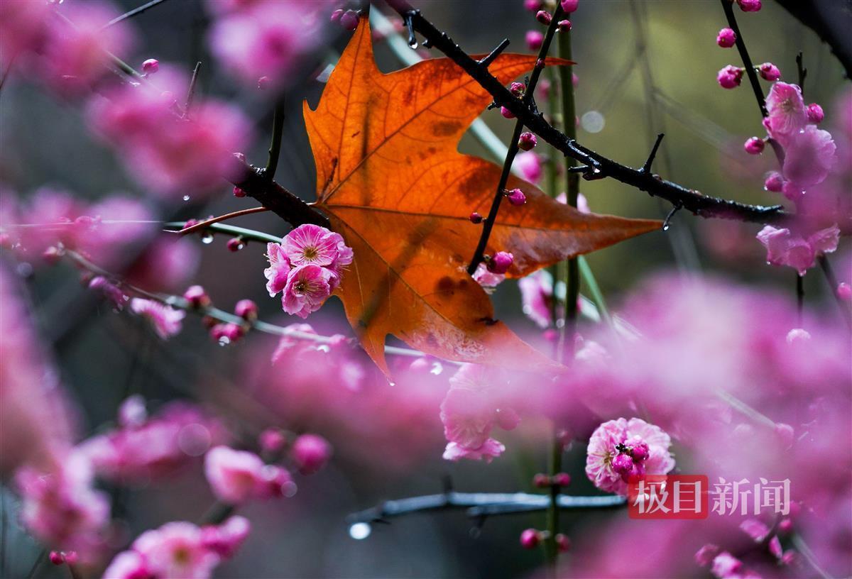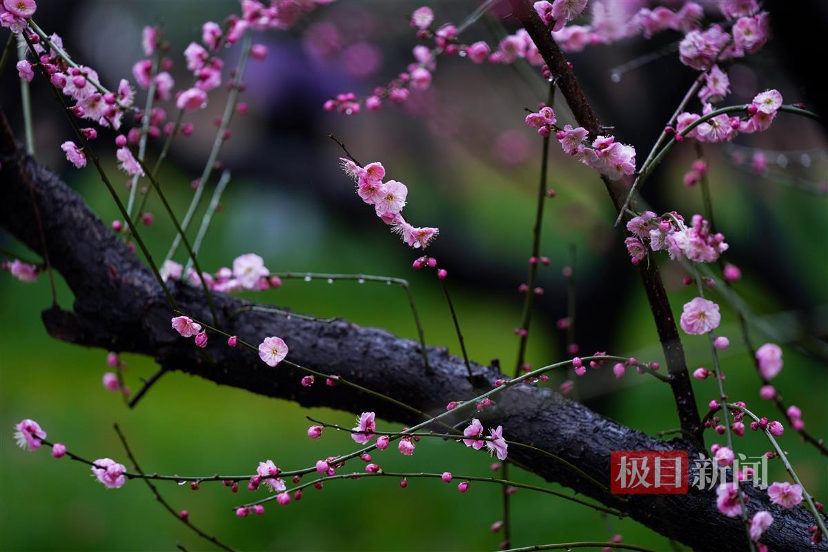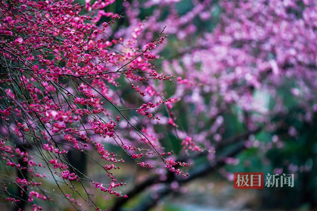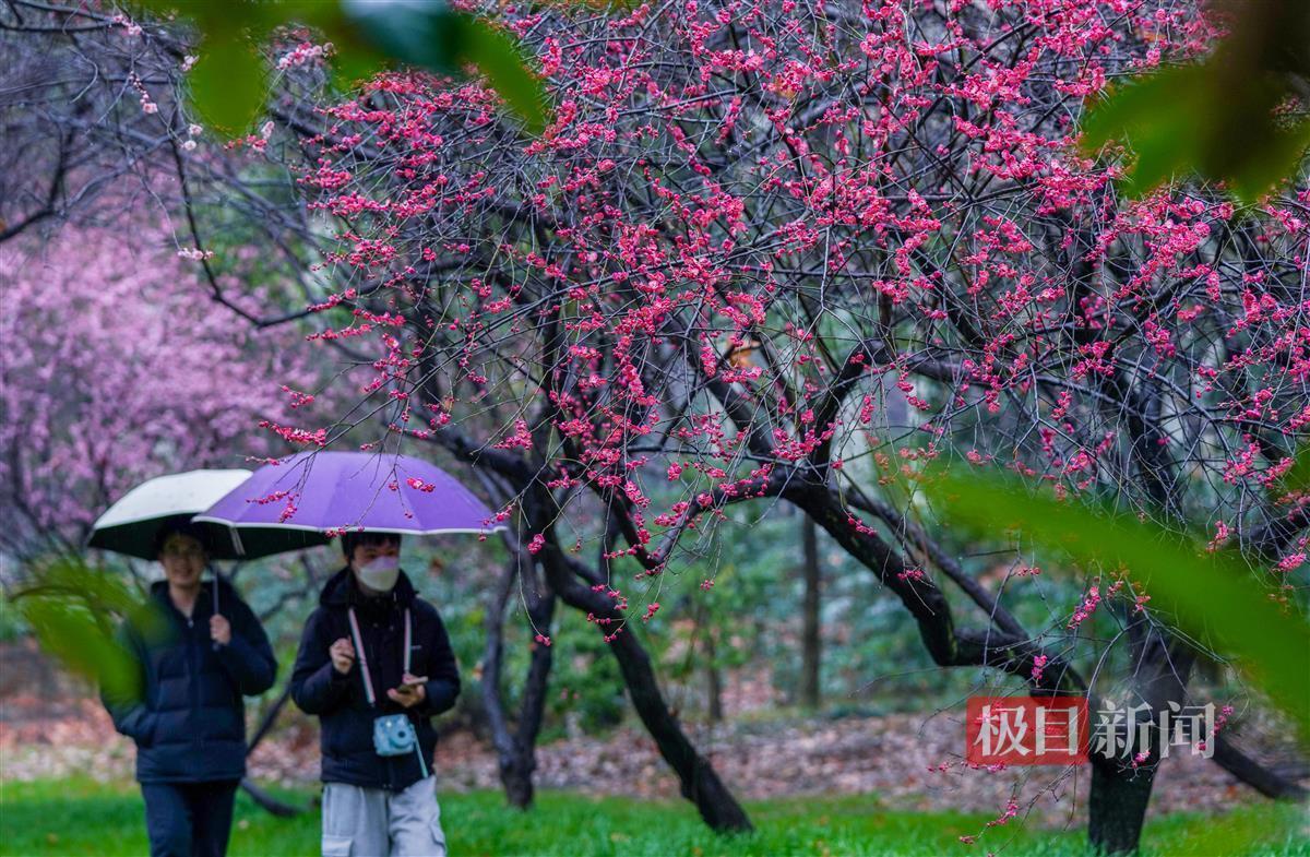 2月13日,极目新闻记者现场看到,位于该校樱花大道鉴湖入口、万林博物馆背后等处小梅林,株株梅树迎着淅沥沥的寒雨傲然绽放娇艳的花朵。不少提前返校的学生打着五颜六色的雨伞,前来赏梅、拍梅。