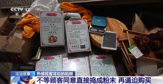 被害人被引入店后,就有店员上来推销中药材。一番讲解后,没等顾客点头同意购买,店员就会直接将药材捣碎成粉末,然后逼迫顾客购买。如果有被害人不同意购买,就会遭遇各种威胁。