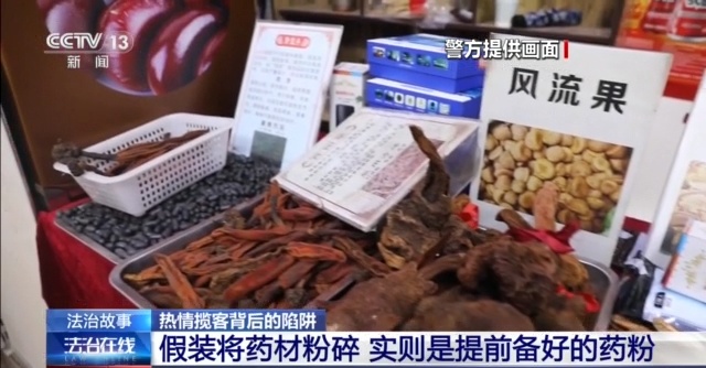 西安铁路公安局安康铁路公安处刑警支队民警 刘达:这些摆放的天麻、铁皮石斛等也只是充当销售道具,其实售卖的并不是这些中药材,而是他们提前准备好的廉价药粉。