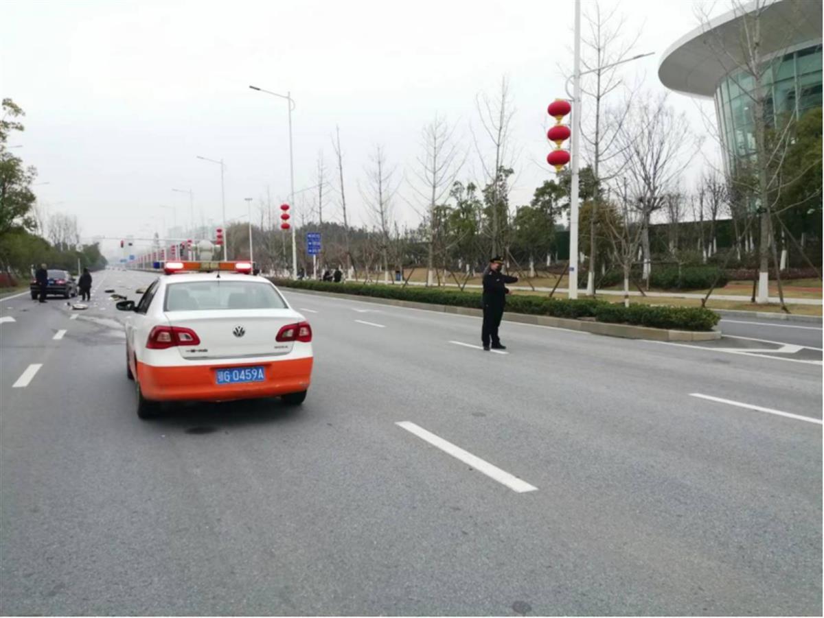 14日下午4时,鄂州市交通运输综合执法支队鄂城大队机动中队执法人员江韬、叶建松在路面巡查时,发现在临空大道发生一起交通事故,一辆黑色轿车和一台电动三轮车发生碰撞,路旁一中年女性仰面躺在地面。