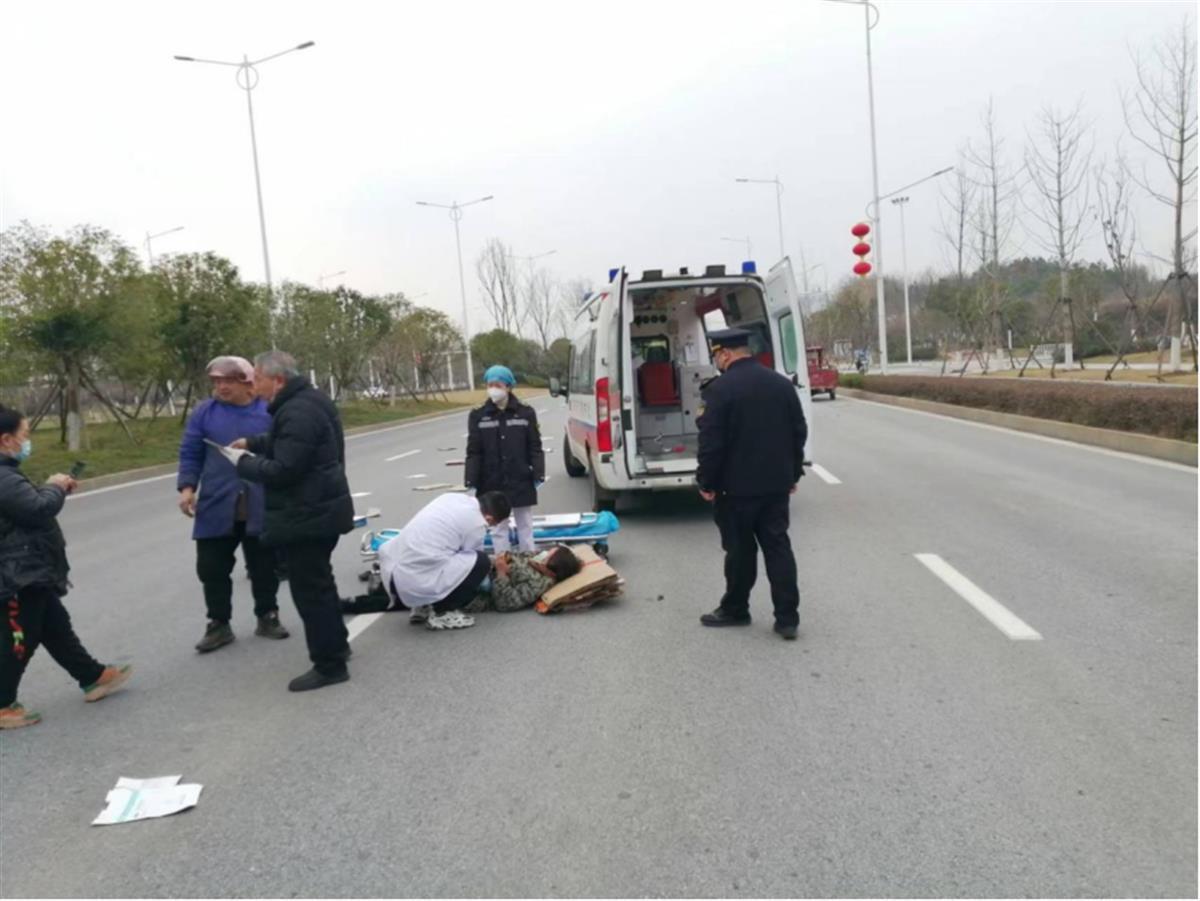 几分钟后,交警和120救护车赶到现场,江韬、叶建松协助医护人员将倒地受伤女子抬上救护车后,重新投入到日常交通执法巡查工作中。