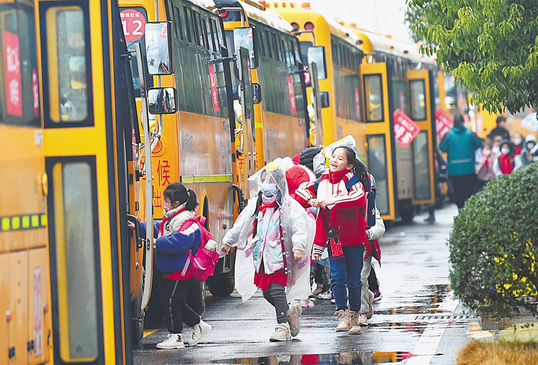 2月13日下午,16辆“大鼻子校车”在武汉市江夏区庙山第二小学校园内等待放学,小学生们有序登上安全、舒适的校车。