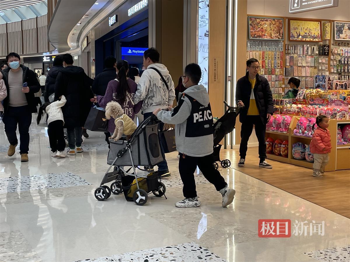 2月15日,在武汉市江岸区万象城内,不少市民推着狗狗推车逛街购物。极目新闻记者看到,这些推车外观与婴儿推车无异,只是体积稍小,推车里坐着一些小型犬,有些狗狗还垫上了宠物专用的尿不湿。