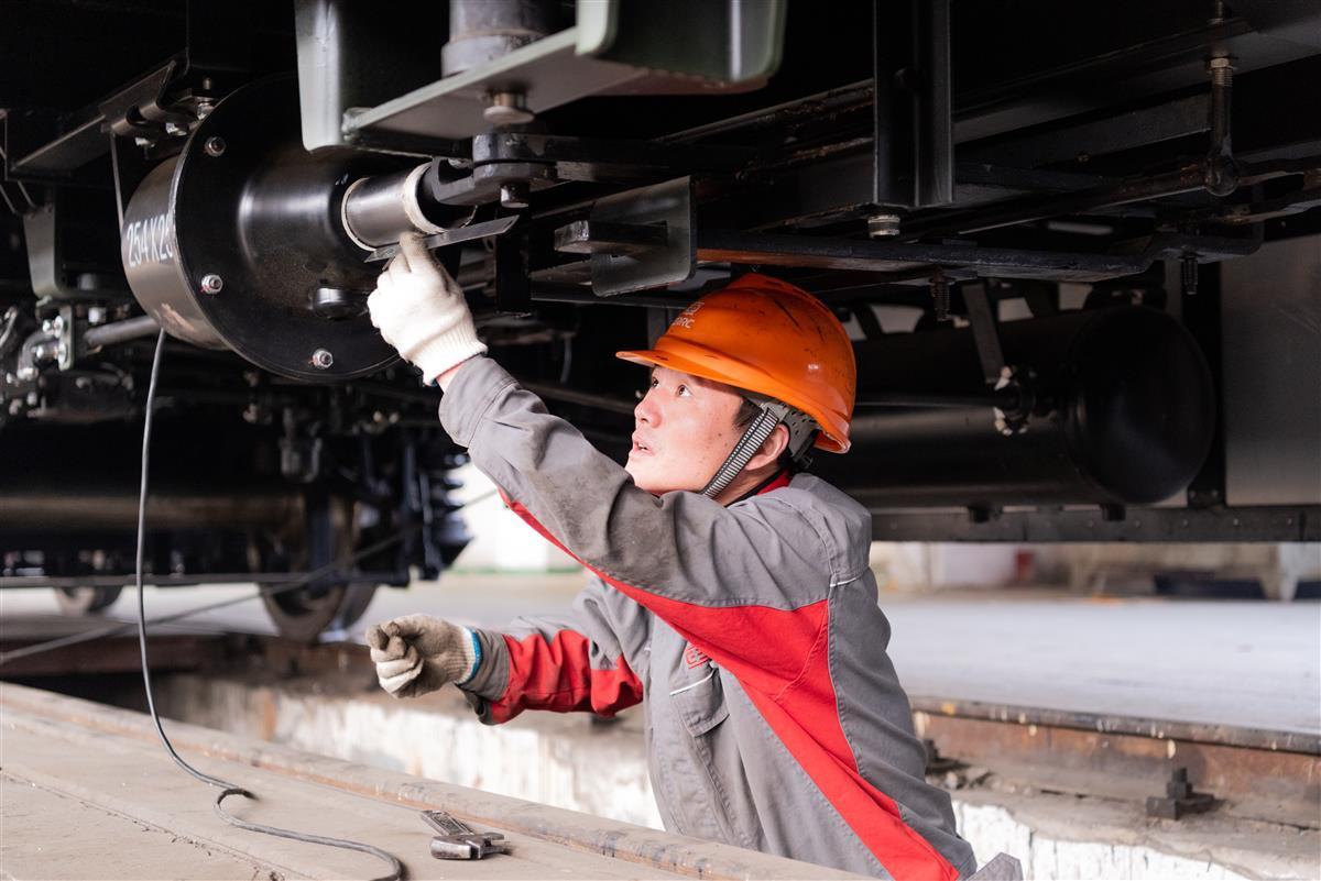 蹲下、弯腰、站起、再蹲下,黄其郭像一名经验丰富的“车辆医生”,对一节节列车进行“把脉问诊”。