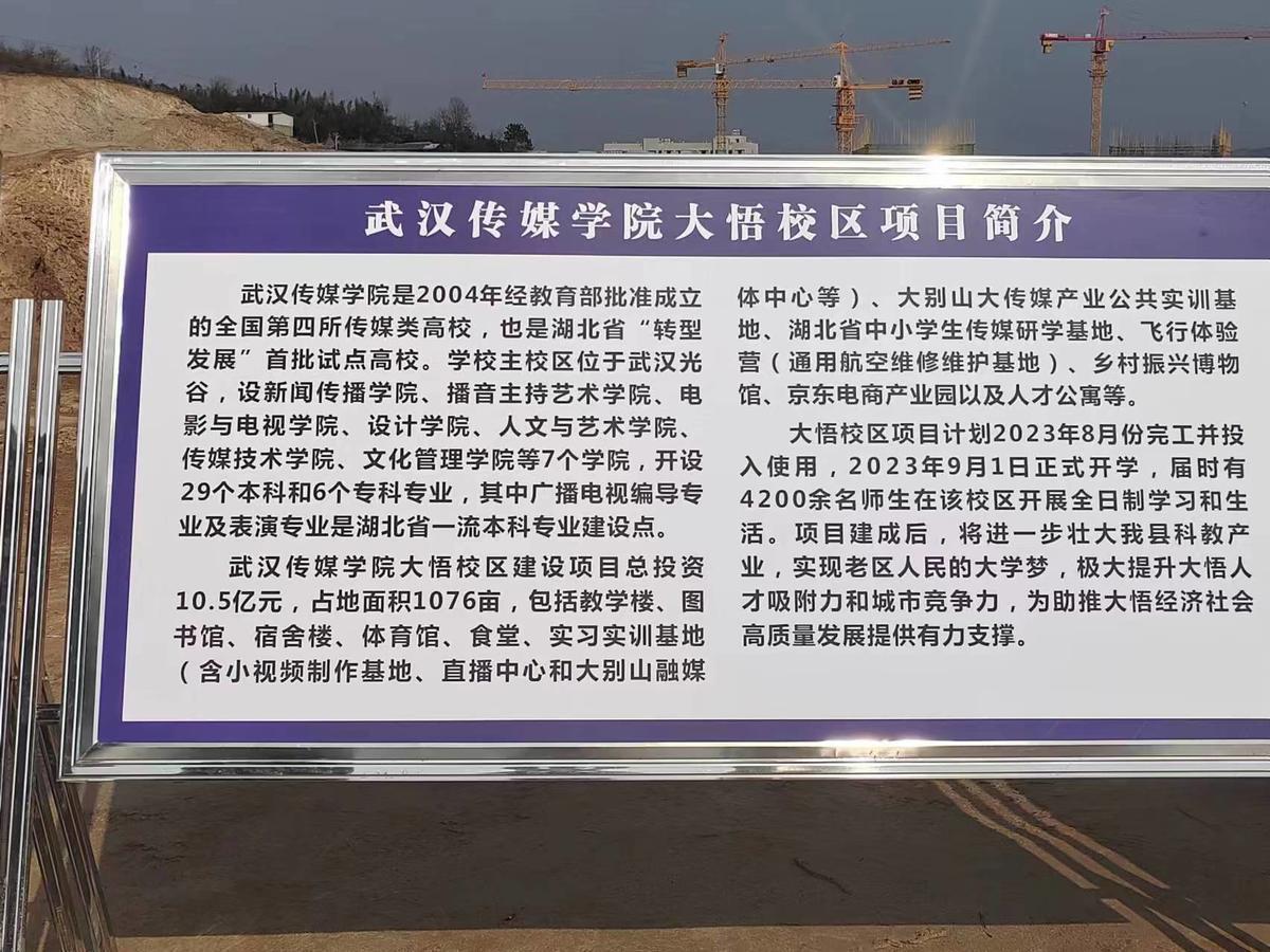 据了解,武汉传媒学院是全国第四所传媒类高校,湖北省“转型发展”首批试点高校。该校主校区位于武汉光谷,设新闻传播学院等7个学院,29个本科和6个专科专业。武汉传媒学院大悟校区建设项目总投资10.5亿元,占地面积1076亩,包括教学楼、图书馆、宿舍楼、体育馆、食堂、实习实训基地、传媒产业公共实训基地、省中小学生传媒研学基地、乡村振兴博物馆、电商产业园以及人才公寓等。