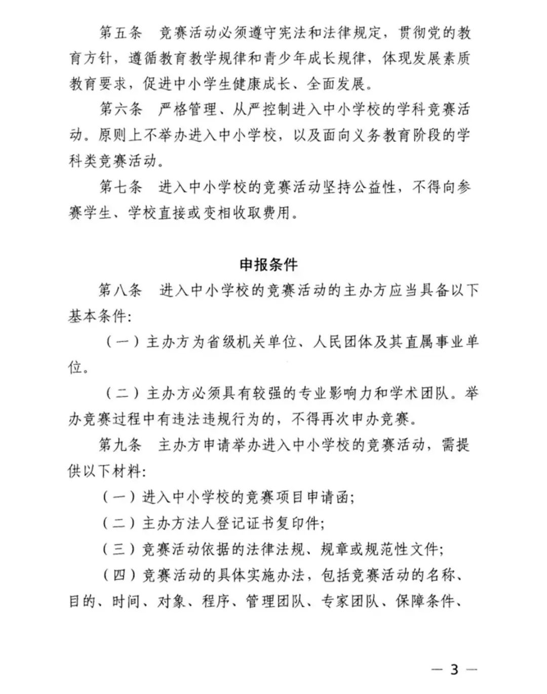 为规范进入中小学校(含幼儿园)的活动管理,防止竞赛项目过多过滥,切实减轻中小学生负担,维护正常教育教学秩序,根据《中共中央 国务院关于深化教育教学改革全面提高义务教育质量的意见》和《面向中小学生的全国性竞赛活动管理办法》要求,制定了此《细则》。竞赛活动主要指面向中小学生的学科类、科技创新类、艺术体育类竞赛等活动。竞赛学科主要包括语文、数学、外语、科学、物理、化学、生物、信息技术、道德法治、思想政治、历史、地理等,以及与升学或考试相关的其他学科及其延伸的竞赛。学科类竞赛活动指的是针对上述学科的具体知识点的各种竞赛活动,不包括经典诵读、辩论演讲、科学实验、编程设计等与学科有关的竞赛活动。《细则》要求,严格管理、从严控制进入中小学校的学科竞赛活动,原则上不举办进入中小学校,以及面对义务教育阶段的学科类竞赛活动。进入中小学校的竞赛活动坚持公益性,不得向参赛学生、学校直接或变相收取费用。经教育行政部门认定的竞赛活动的获奖结果,视为中小学的荣誉,记入中小学生成长记录,作为学生综合素质评价的依据,不得作为中小学校招生的参考依据和入学条件。附:《关于面向中小学生的全省性竞赛活动实施细则》