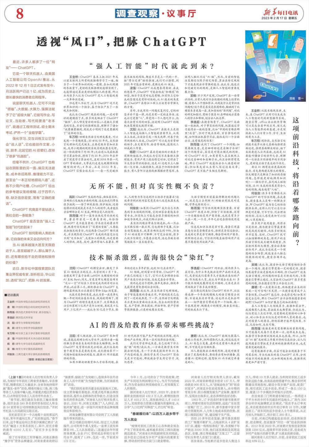 沈阳:我认为,ChatGPT在技术上是弱人工智能走向强人工智能的重要节点。从商业上来说,应该会引发一场大洗牌。对善于使用网络的人来说,ChatGPT可以成为非常好的助手,在文案写作、检索等领域,能简化三四成的工作量。