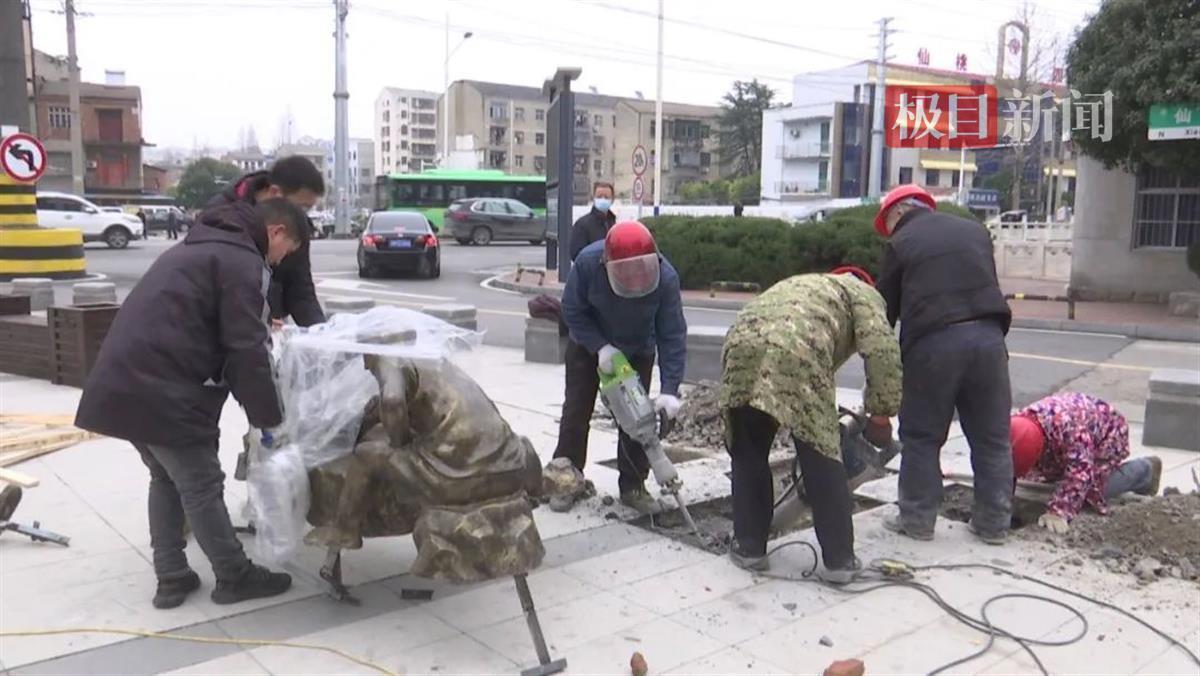 据康湾路美丽街区改造工作人员涂路介绍,广场的三个雕塑主要是弘扬沔阳文化,还做了一些花箱和休闲坐凳,整个康湾街区的文化氛围背景墙也在施工中。