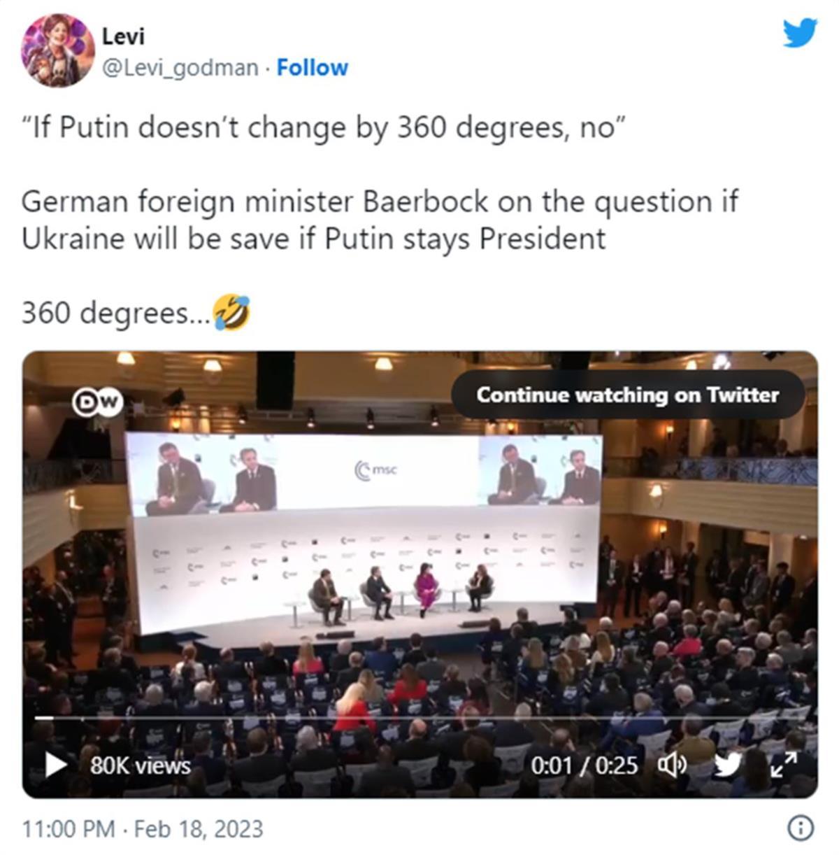 据《今日俄罗斯》2月18日报道,德国外交部长安娜莱娜·贝尔伯克在慕尼黑安全会议上发言称,俄罗斯总统普京必须做出“360度转身”,乌克兰才能安全。俄罗斯前总统梅德韦杰夫指出,她这意思换句话说,普京必须继续做自己正在做的事情。