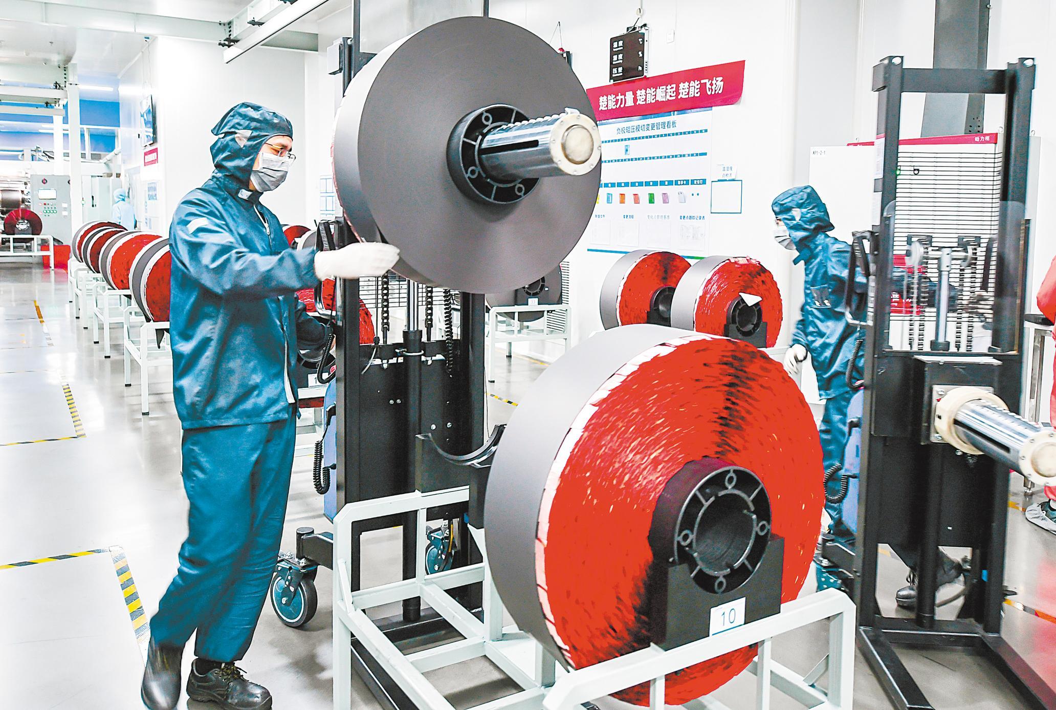 2月14日,位于武汉市江夏区大桥现代产业园的楚能新能源股份有限公司一工厂里,工人们正在锂离子电池生产线上忙碌。
