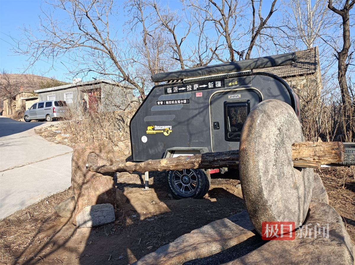 山东临沂平邑县白彦镇孙凡宝的家门前,一辆小旅行挂车停在石碾旁,它曾陪伴孙凡宝到全国各地旅行。