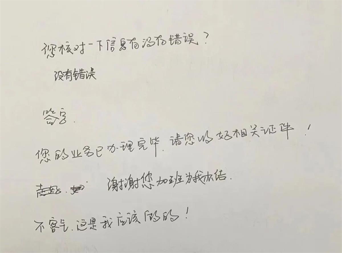 临走,这位特殊办事市民露出满意的笑容,在纸上书写“谢谢您加班为我办结”,并对工作人员竖起大拇指,一个劲地点头表示感谢!