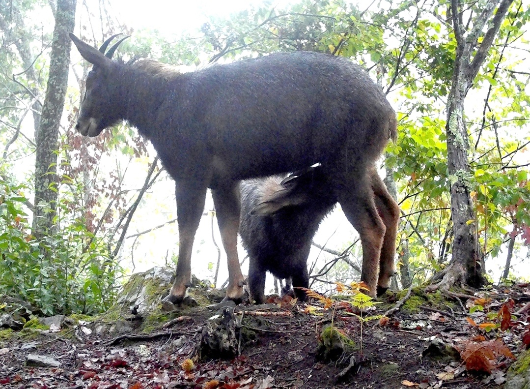 中华鬣羚幼崽“跪地求乳” 通讯员供图