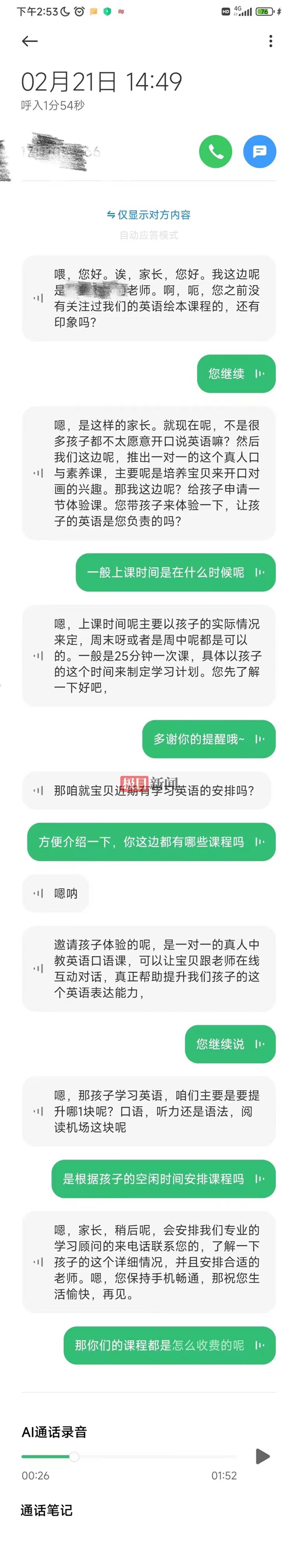 在刘先生发来的语音里显示,推销员在询问是否有兴趣了解绘本之后,AI回答,“您请继续”。而在推销员详细介绍了课程之后,智能AI还询问了课程设置、课程时间、如何收费等情况,最后还礼貌地挂掉了电话,“我觉得太神奇了,没想到AI已经可以和人正常对话了,我觉得挺有意思,就把这个经过分享给你们。”