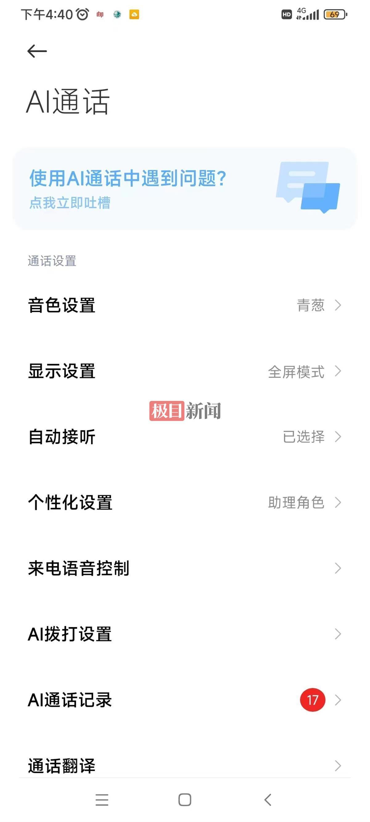 刘先生打电话告诉极目新闻记者,平时工作繁忙,为了避免接到诈骗电话或者是骚扰电话,自己给手机设置了智能AI接听功能,而AI手机通话助理在自动接听电话后会进行语音存储,没想到,2月21日,他发现,自己手机的AI手机通话助理竟然和前来推销绘本的销售员聊了一分多钟,令他哭笑不得。