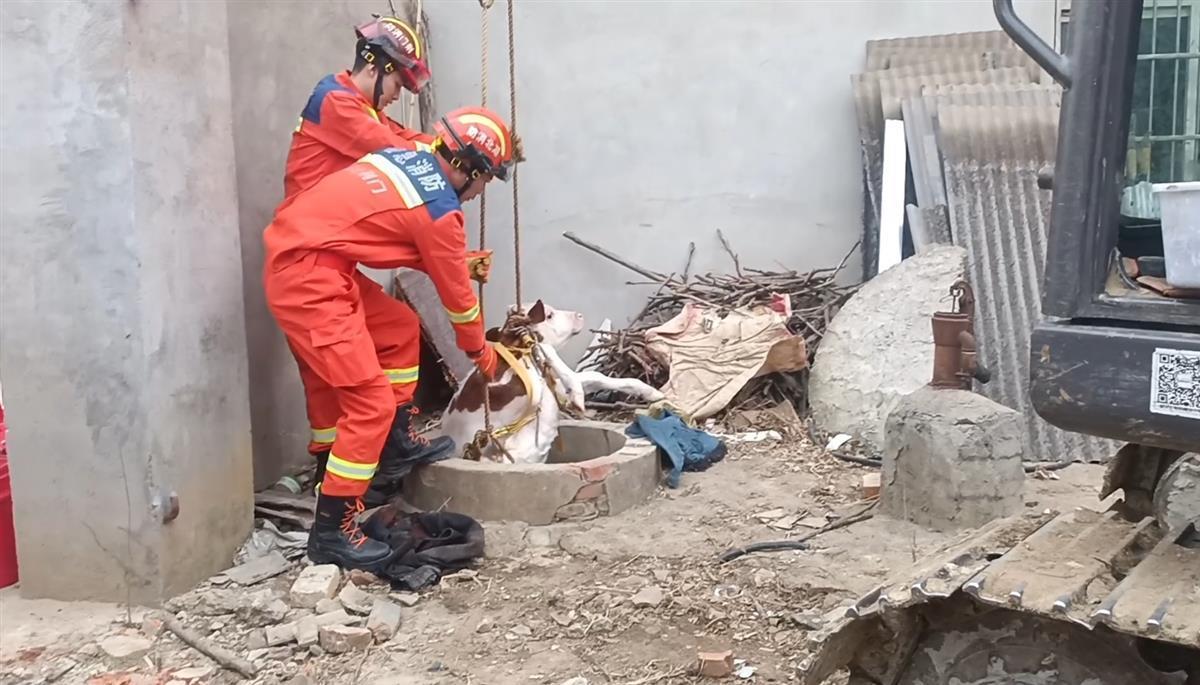 消防救援人员下井救小牛犊