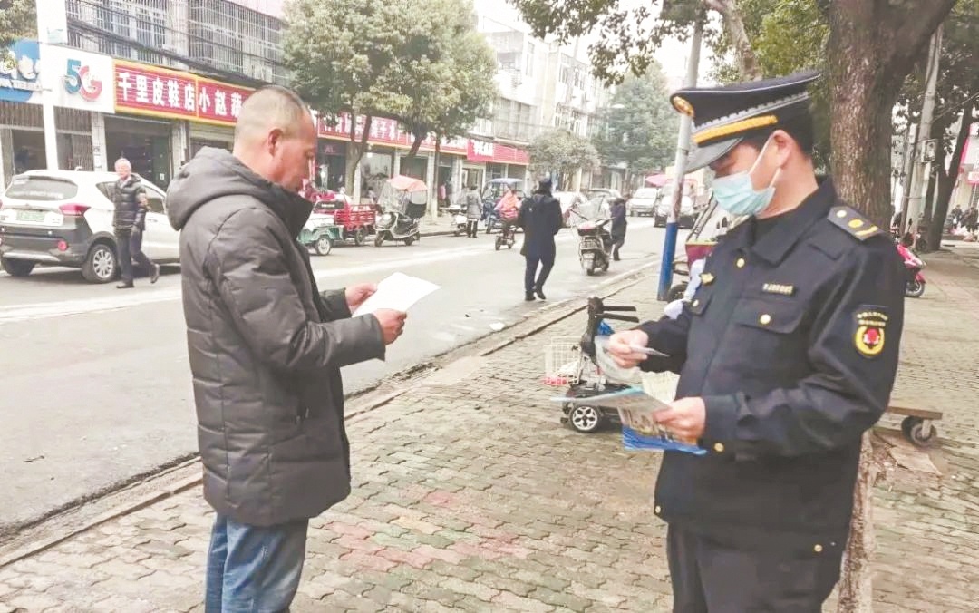 城管队员向市民发放“城管局长热线”宣传单 通讯员供图