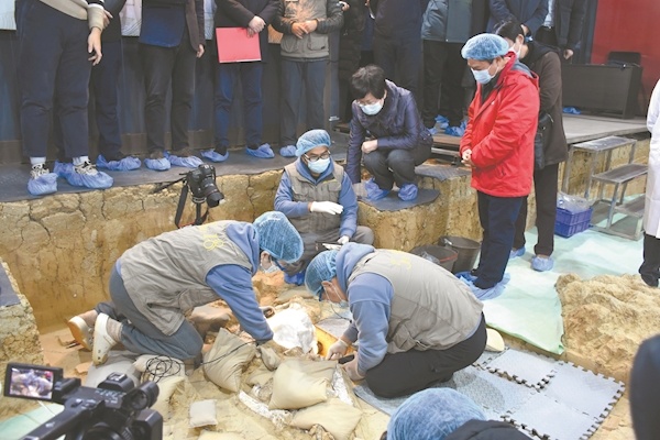 图片由湖北省文物考古研究院提供 “郧县人”3号头骨提取现场
