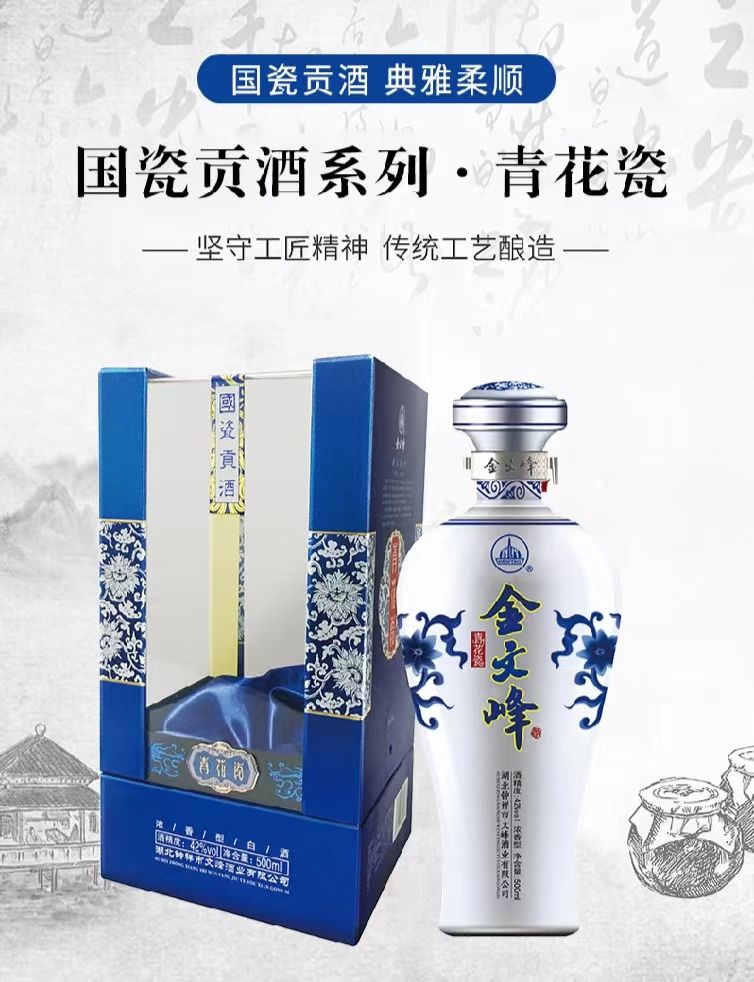 金文峰酒产自世界长寿之乡——湖北钟祥,1952年钟祥县人民政府合并3家号称祖传为明朝嘉靖酿造御用美酒的酒坊,组建成立文峰酒业前身——钟祥县国营酒厂。1988年钟祥县国营酒厂生产的“皇陵特曲”荣获湖北省人民政府颁发的首届白酒评比“金钟奖”,“金钟奖”获得者即为湖北老八大名酒。1992年钟祥县国营酒厂更名为湖北文峰酒厂,2003年湖北文峰酒厂改制成湖北文峰酒业有限公司,金文峰逐渐成长为地缘优势中高端白酒品牌。据悉,做为文峰酒业核心大单品的金文峰青花瓷酒在荆门区域单品年销售已经过亿元,牢牢占据荆门400元价格带的白酒商务消费市场。