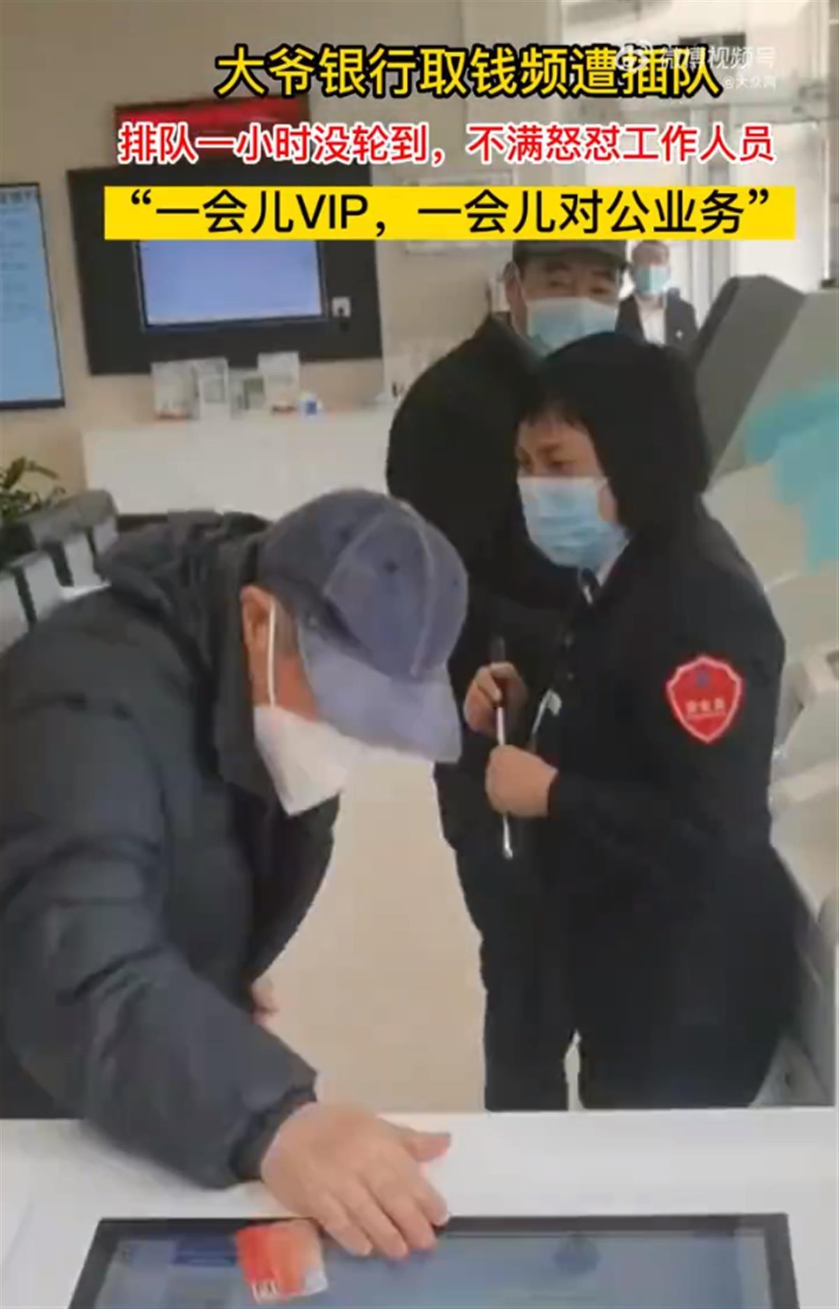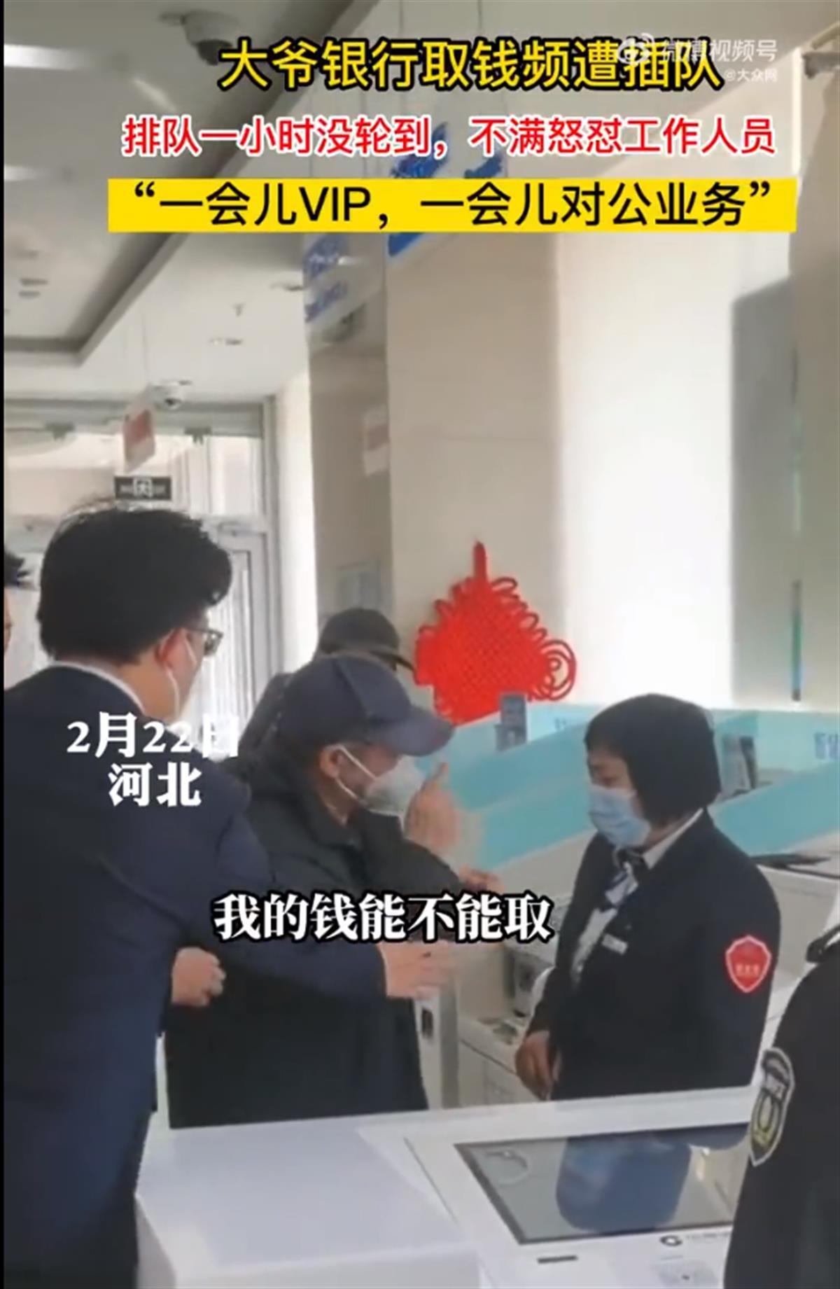 2月23日,河北一位老大爷在银行办业务时频遭插队,排队一小时没排上,摔卡怒斥工作人员,引发关注。大爷对着工作人员表示,“我的钱能不能取?”随后把卡摔在了机器上。拍摄者称,原因是一会一个VIP,一会一个公对公。让大爷排队等了一个小时。(据2月25日红星新闻)