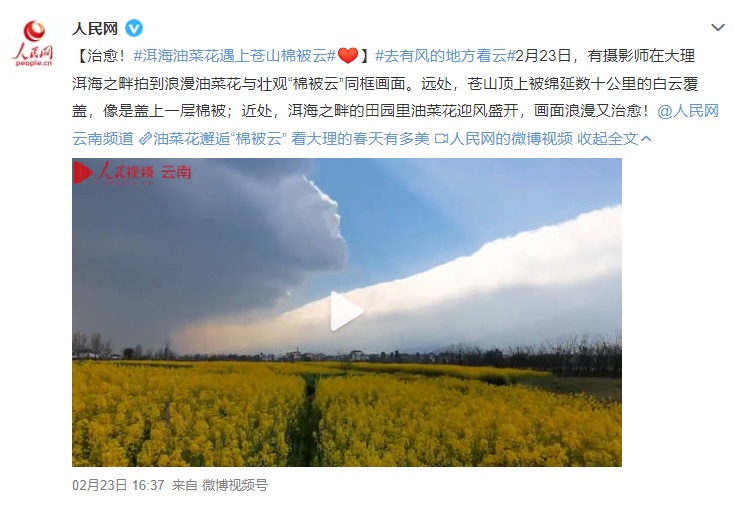 【治愈!洱海油菜花遇上苍山“棉被云”】2月23日,有摄影师在大理洱海之畔拍到浪漫油菜花与壮观“棉被云”同框画面。远处,苍山顶上被绵延数十公里的白云覆盖,像是盖上一层棉被;近处,洱海之畔的田园里油菜花迎风盛开,画面浪漫又治愈!