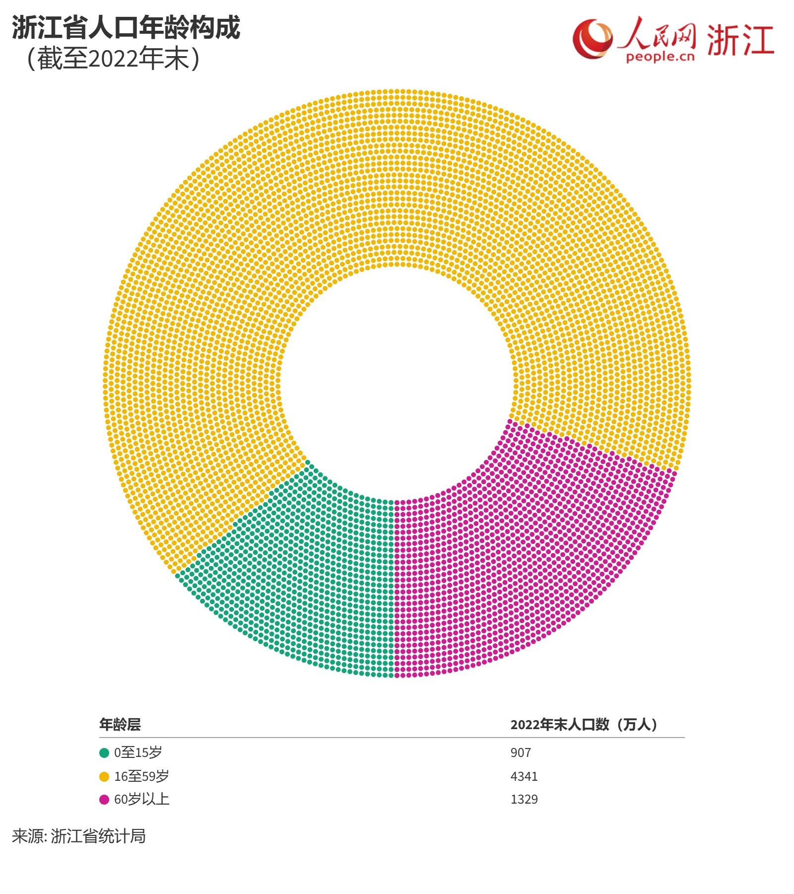 值得注意的是,相较于2021年末,2022年末浙江省常住人口中,0至15岁青少年群体和16至59岁中青年群体的数量和占总人口比例正在减少;60岁以上老年群体增加了77万人,已达到1329万人,占总人口比例突破20%,尤其是65岁及以上人口达到了981万人。浙江省正逐渐迈入老龄化社会。