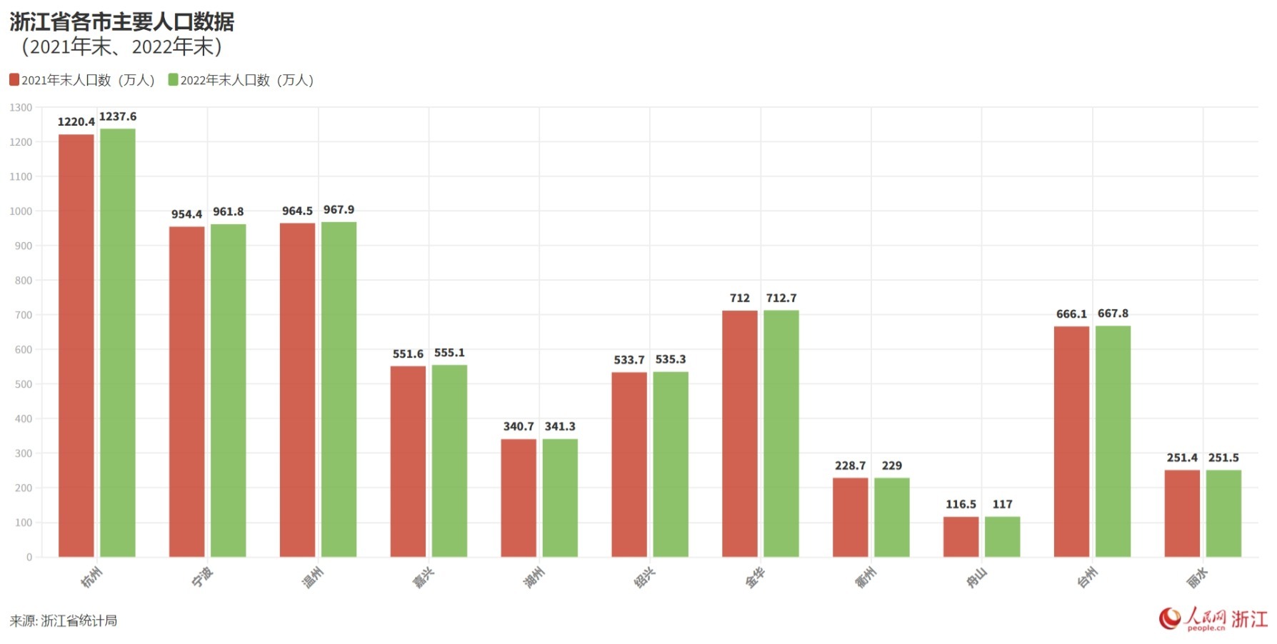 从浙江省各地市看,截至2022年末,省会杭州常住人口达到了1237.6万人,牢牢占据全省人口第一的位置;温州、宁波两地紧随其后,分别达到967.9万人、961.8万人;金华常住人口位居全省第四,达到了712.7万人,与前三位仍有较大差距。与2021年末相比,除杭州、宁波常住人口分别增长17.2万人、6.6万人外,其余各市常住人口变化幅度不大。