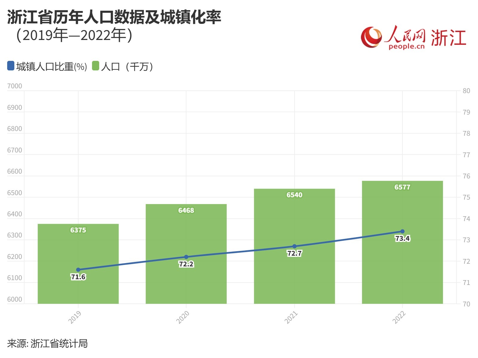 2月22日,浙江省统计局公布了2022年浙江省人口主要数据公报。截至2022年末,浙江全省常住人口为6577万人,其中城镇人口为4826万人、农村人口为1751万人,城镇人口占总人口的比重(即城镇化率)为73.4%。