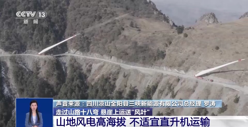 四川凉山金阳县三峡新能源有限公司总经理 罗涛:运这个项目的叶片为什么说难于上青天?它主要是因为这个道路左边是悬崖,右边是峭壁,而且路面根本就没什么办法去扩宽,而且在这边稍不注意的话,就会发生安全事故,所以这一点上运输的难度很需要高超的技术。这样就能缩短了我们的设备运输的距离,也能快速地去完成这个项目的建设。