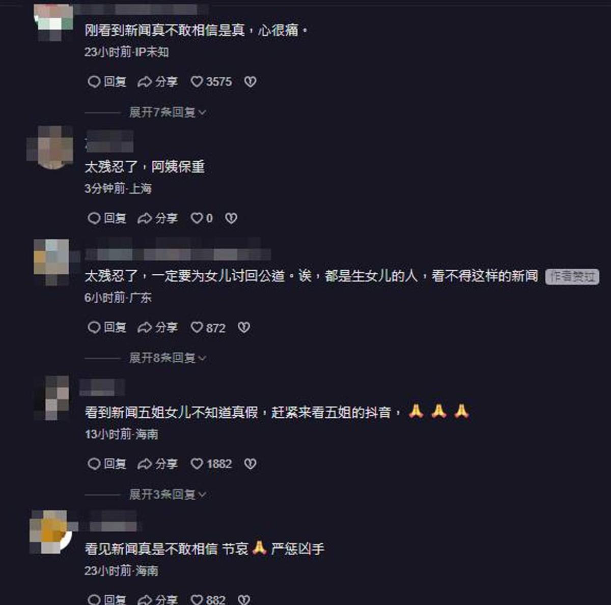 在发生惨剧后,不少网友在该抖音账户下留言。有人安慰道:“真的太残忍了,阿姨节哀。”“刚看到新闻真不敢相信是真,心很痛!”“太痛心了,永远不敢相信这是真的。”“愿妹妹天堂安息,严惩行凶者。”极目新闻记者注意到,对于部分网友的致哀留言,账号主人有回应。