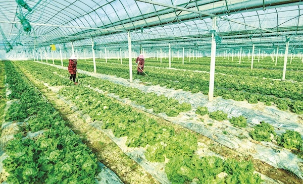 农户们在蔬菜大棚里干劲十足地实施春耕