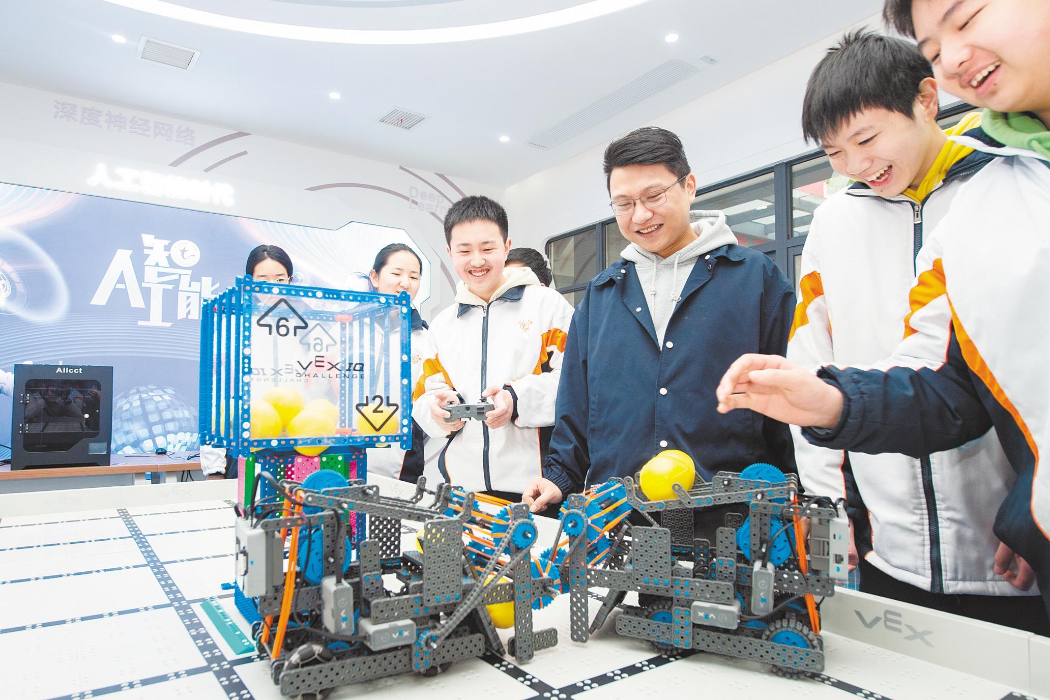 2月15日,在武汉市七一中学人工智能教室里,学生们在老师的带领下操作机器人。