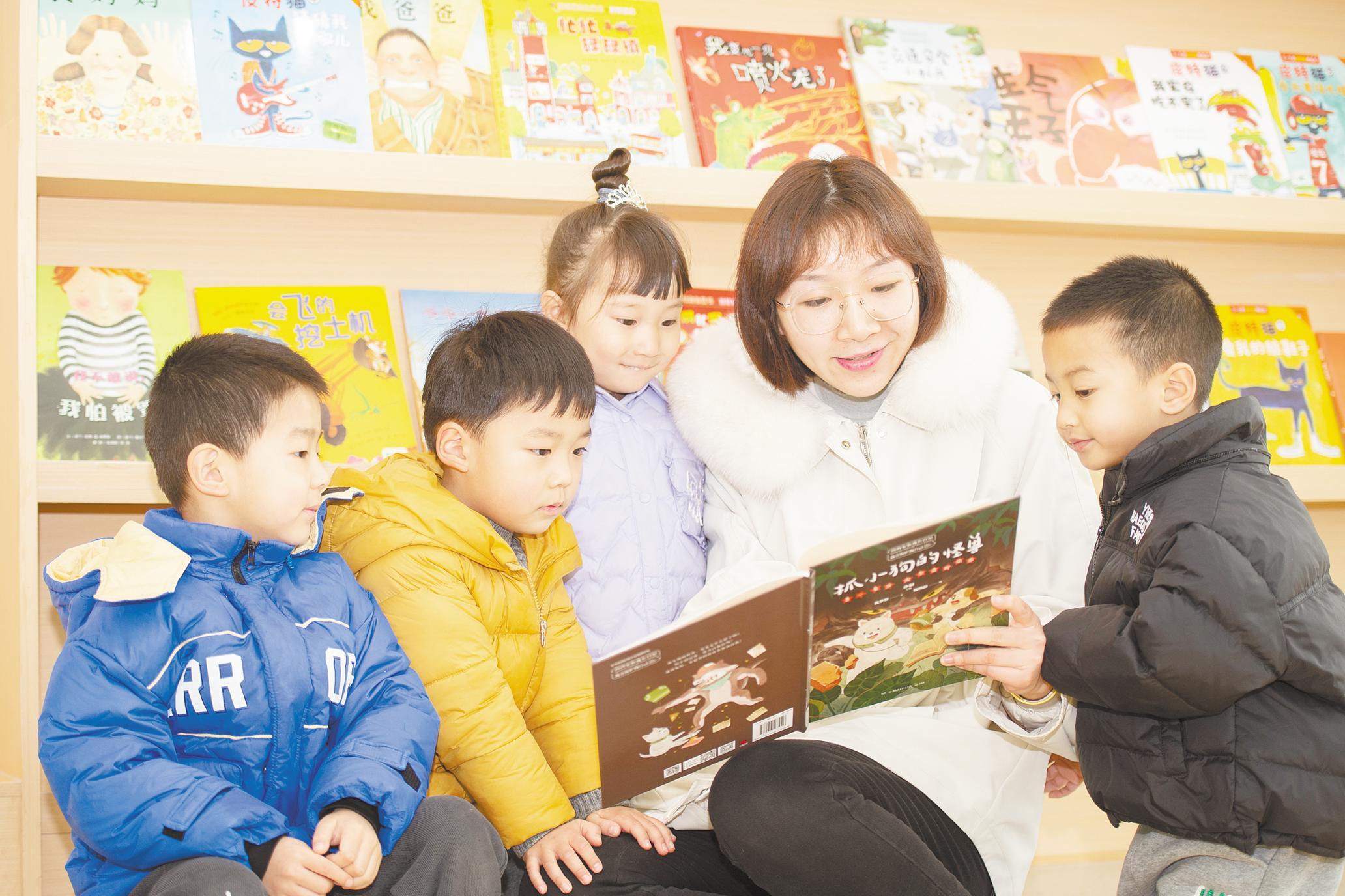 2月10日,在武汉市青山区第二幼儿园青山樽园的图书角,中班孩子们围在老师身边看故事书。