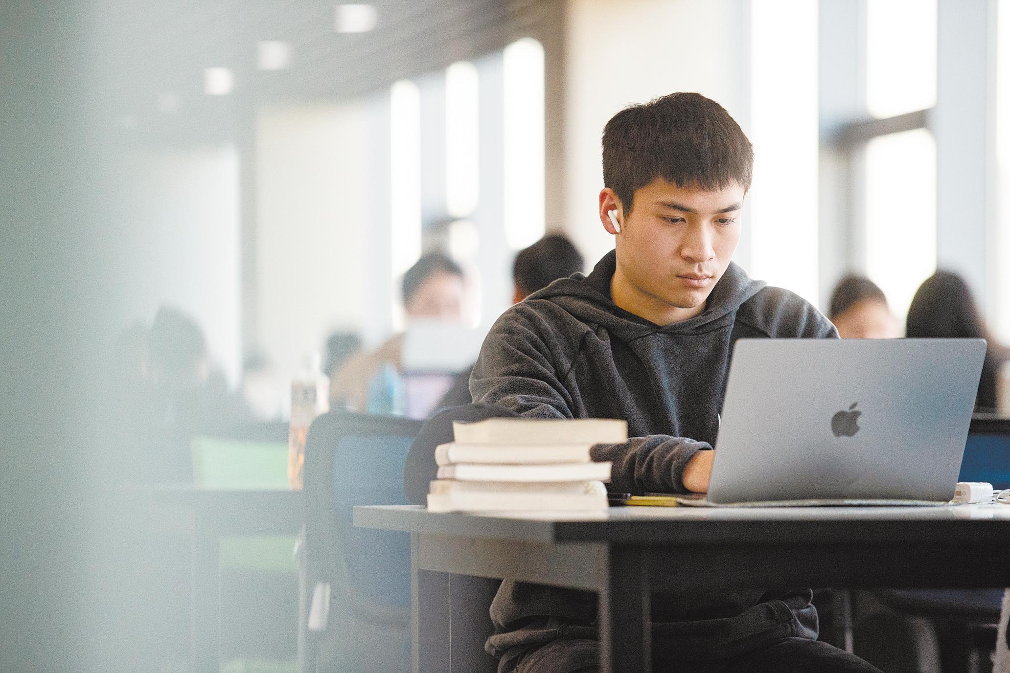 2月26日,在华中师范大学图书馆里,学生们在专注自习。