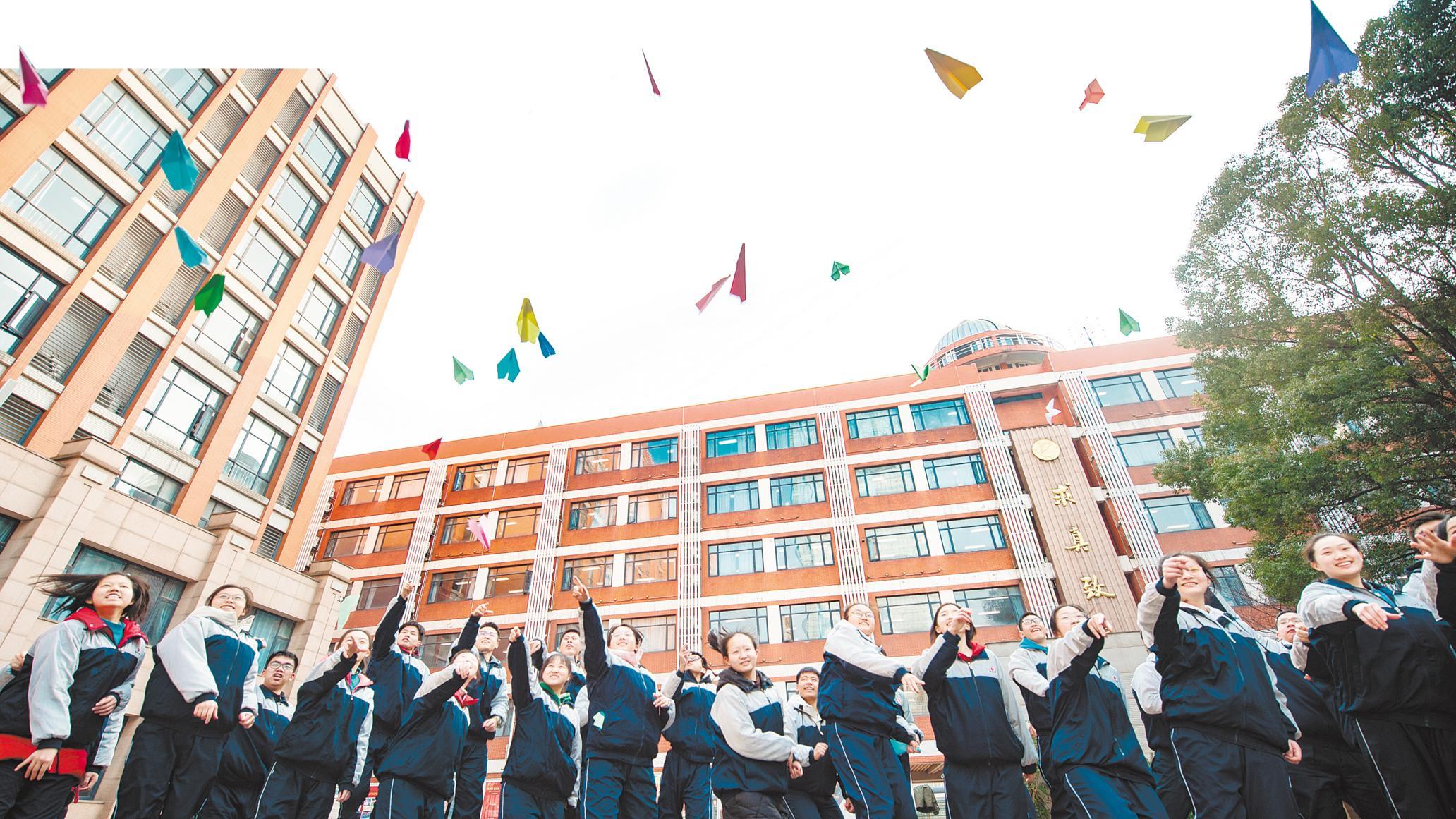 2月15日,在武汉市第二中学,高二学生们在操场上放飞心愿纸飞机,解压迎考。