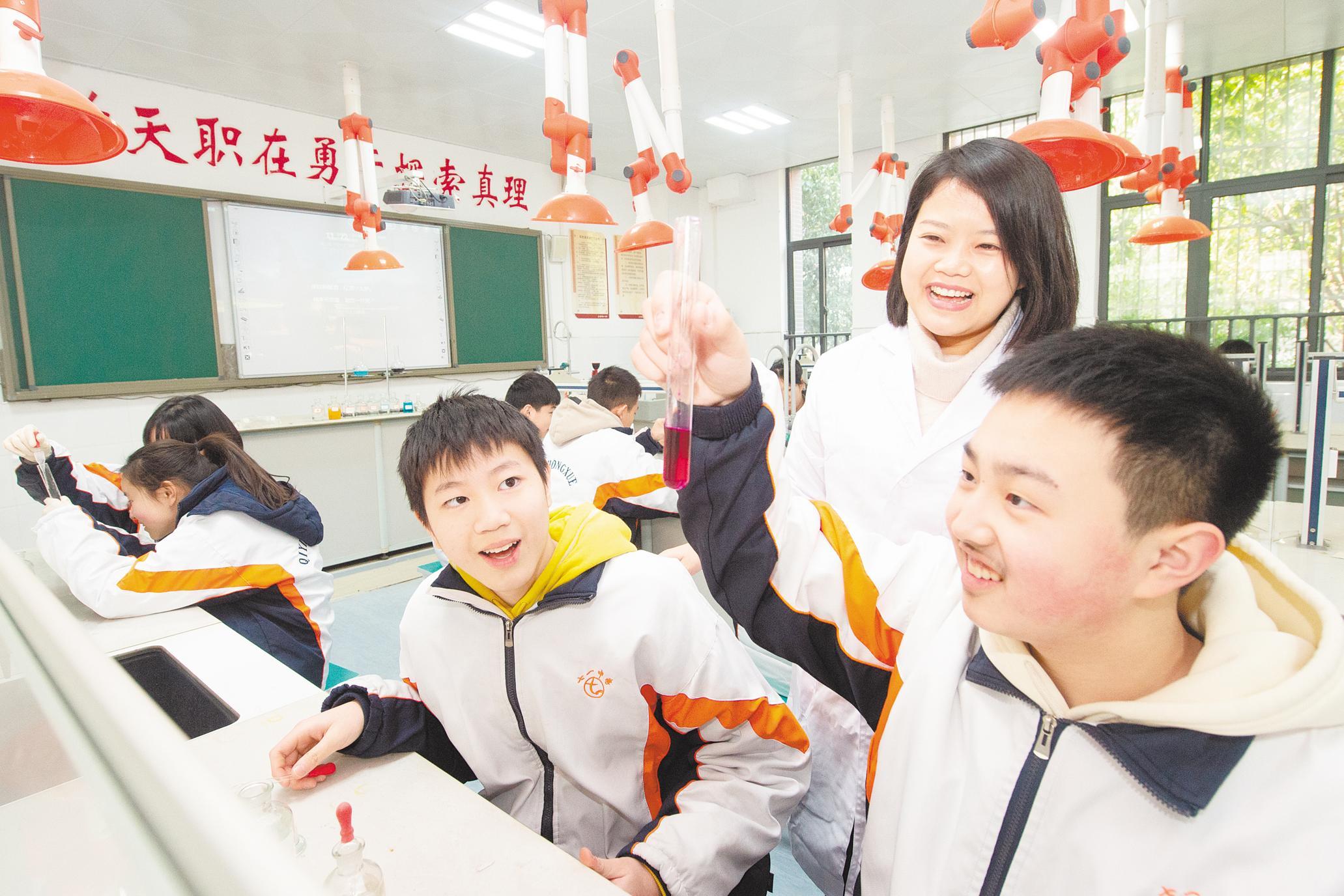 2月15日,在武汉市七一中学,学生们在老师的带领下做实验。